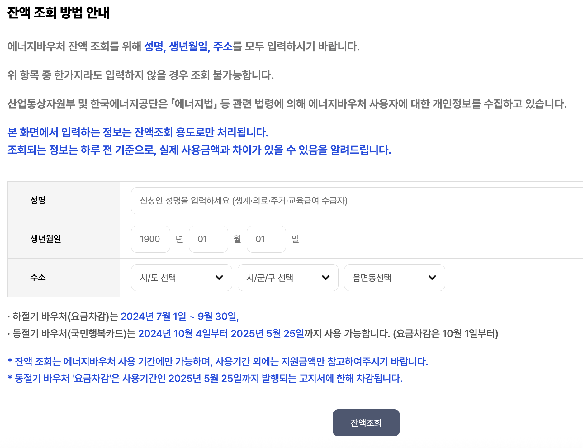 잔액조회를 위해서는 한국에너지공단의 에너지 바우처 공식 누리집을 이용하면 됩니다.