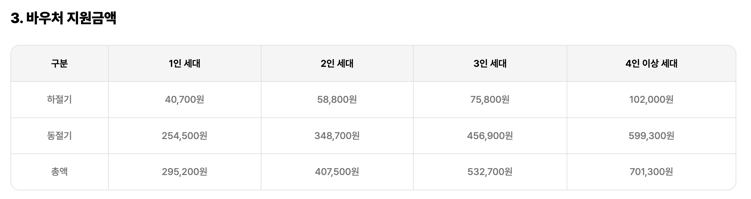 특히 여름 바우처는 7월부터 9월까지, 겨울 바우처는 10월부터 이듬해 4월까지로 구분되어 사용됩니다.
