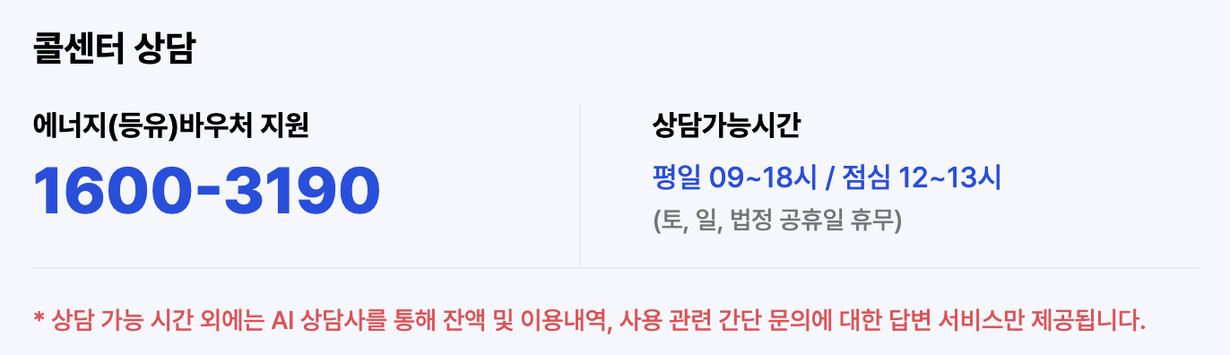 이러한 경우에는 에너지 바우처 고객센터(☎ 1670-7653) 또는 거주지 주민센터에 문의해 정확한 내역을 확인하는 것이 좋습니다.