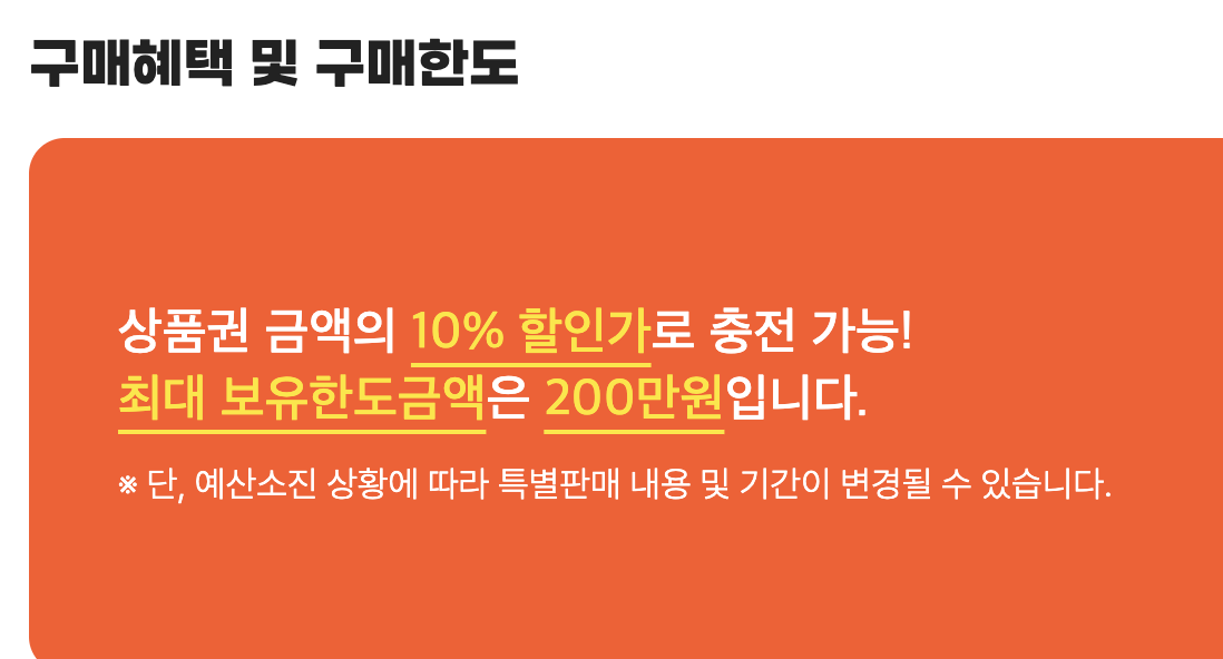 - 구매 시 5~10% 할인 혜택이 자동 적용되며, 월 최대 200만 원까지 할인이 가능하니 주의깊게 금액을 선택하세요.