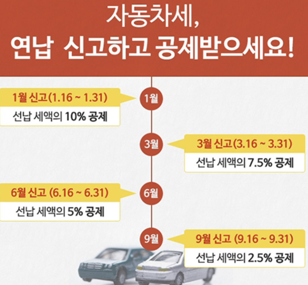 자동차세 연납제도는 한 해 동안 납부해야 할 자동차세를 1월, 또는 분기별로 미리 납부하면 일정 금액을 할인해 주는 제도입니다.